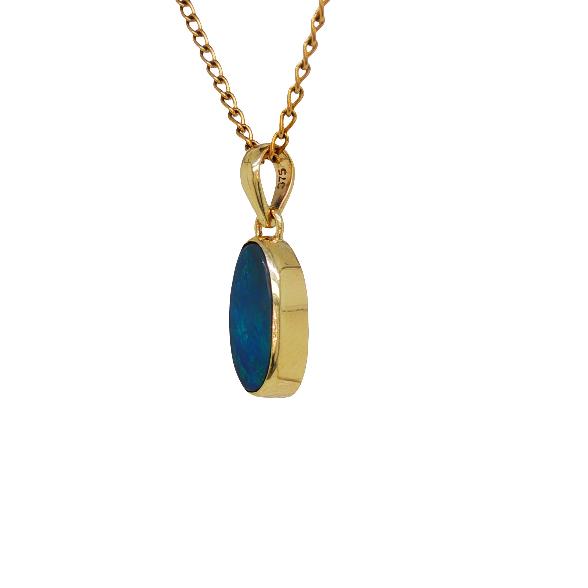 This 9ct Yellow Gold Lightning Ridge Solid Opal pendant showcases the captivating beauty of Australian Opal. The 15mm x 6mm bezel-set gemstone reveals mesmerising blue and green flashes, glowing warmly in every light. Expertly crafted, the pendant is suspended from a classic bale designed to suit a fine to medium chain (chain not included). A timeless piece that captures the essence of natural Australian Opal, perfect for adding a touch of luxury and colour to any look.