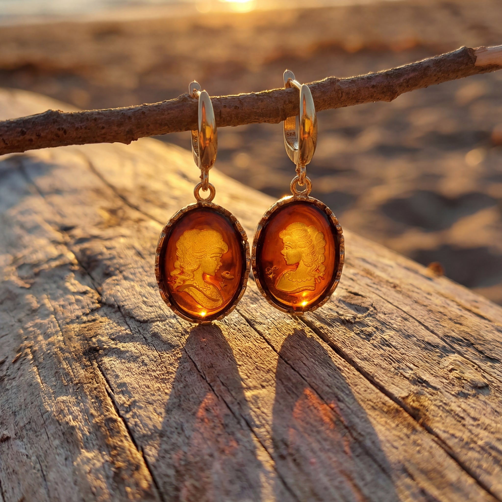 These Gold Plated Sterling Silver Baltic Amber Cameo earrings are crafted in Poland with remarkable artistry. Each Amber Cameo displays finely carved detail, its warm glow enhanced by an intricate filigree frame that circles the piece like delicate lace. The design is completed with secure latch-back hooks, giving the earrings a graceful drop and comfortable wear. Each Cameo, measures 22mm x 17mm, they offer a classic silhouette with a touch of old-world elegance—perfect for buyers seeking something distinctive and beautifully made.