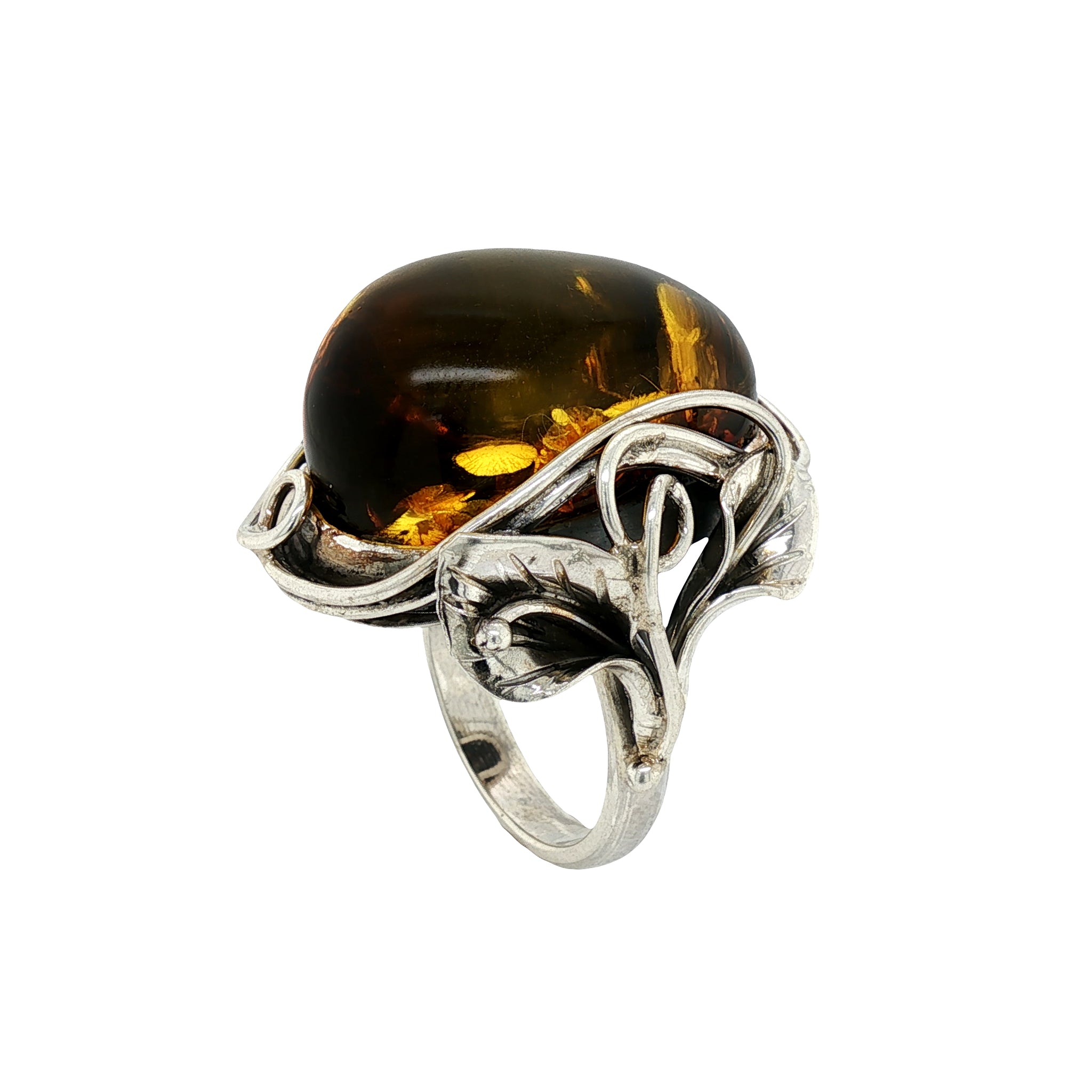 Handcrafted in Poland, this Sterling Silver Baltic Amber ring showcases a large cabochon Baltic Amber gem with warm honey tones and inclusions that make this piece one of a kind. The setting features an ornate garden motif that frames the Amber beautifully, creating a bold, sculptural statement on the hand. Sized R (8 ¾), the ring has a substantial profile, with the ring body measuring 33mm long, 26mm wide, and 17mm high—ideal for lovers of distinctive European Amber jewellery with presence and character.