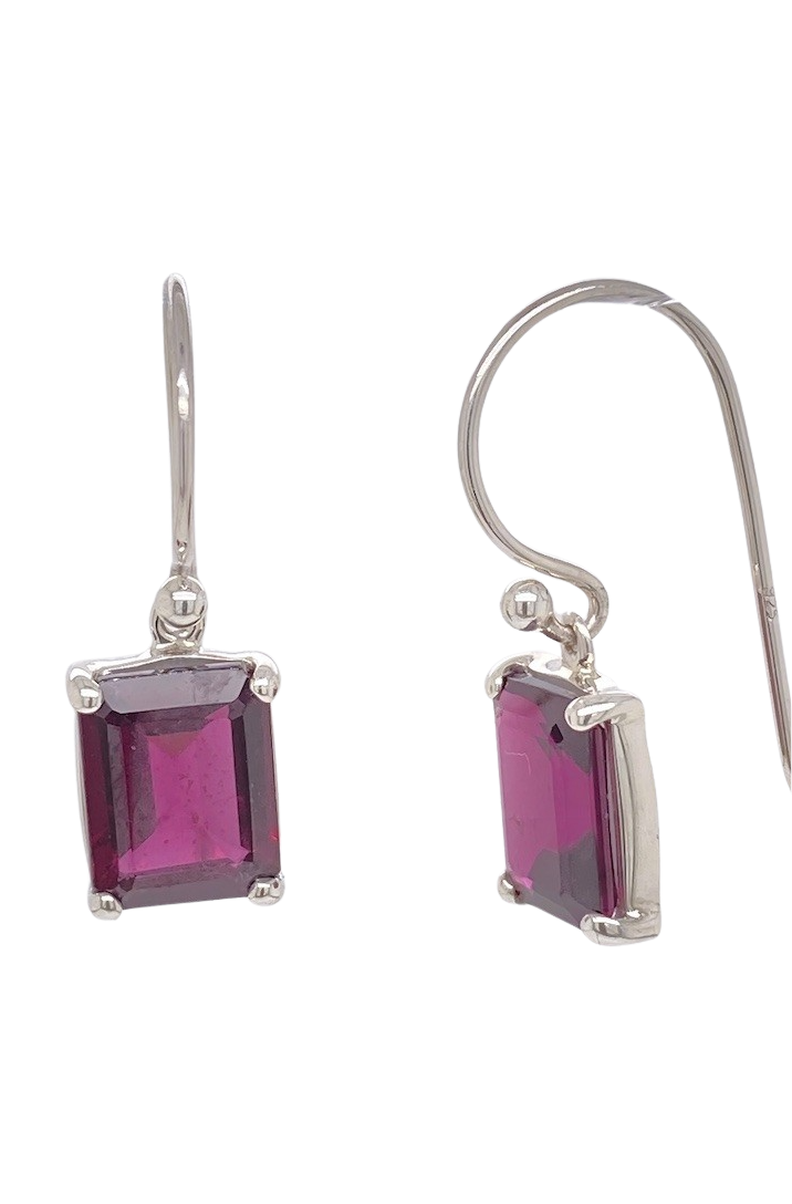 Ignite your elegance with these exquisite Sterling Silver Rhodolite Garnet earrings, where vintage charm meets modern allure. Each earring features a vivid 9mm x 7mm emerald-cut Rhodolite Garnet, claw-set to capture the light in every facet, and suspended gracefully from classic Shepherd hooks. The gemstones shimmer in radiant pink-red tones, reminiscent of twilight roses and fine wine—a timeless statement of feminine sophistication. Set in luminous Sterling Silver, these earrings are a graceful finishing touch for romantic evenings or refined daily wear.
