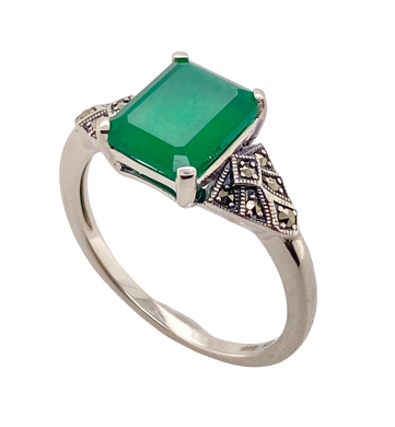 Sterling Silver Marcasite, Green Agate and Black Enamel Ring. 18-159GAG