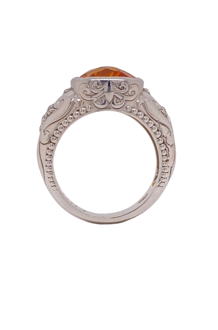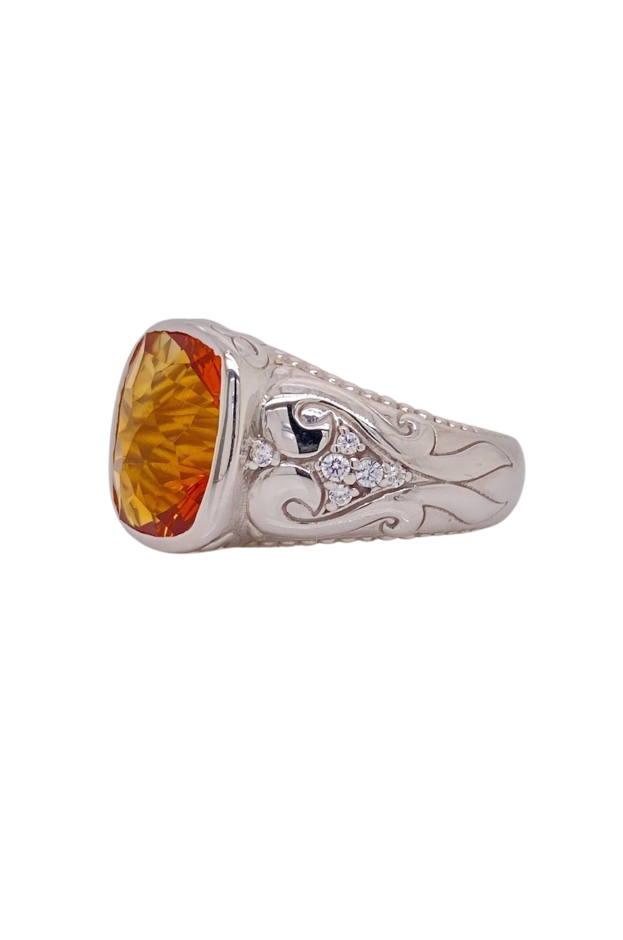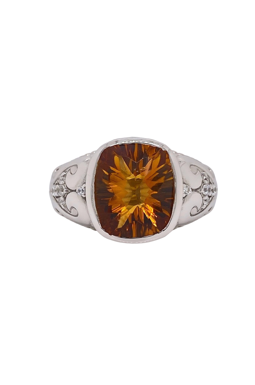 This elegant Sterling Silver ring showcases a warm golden Citrine gemstone, bezel-set with a striking checkerboard faceted face measuring 12mm x 10mm. The vibrant centre stone is beautifully accented by sparkling Cubic Zirconia on the shoulders, with intricate filigree scroll work adding timeless detail to the design. Crafted in a size N (6 ¾), this gemstone ring combines sophistication and everyday wearability, making it a versatile piece for any jewellery collection.