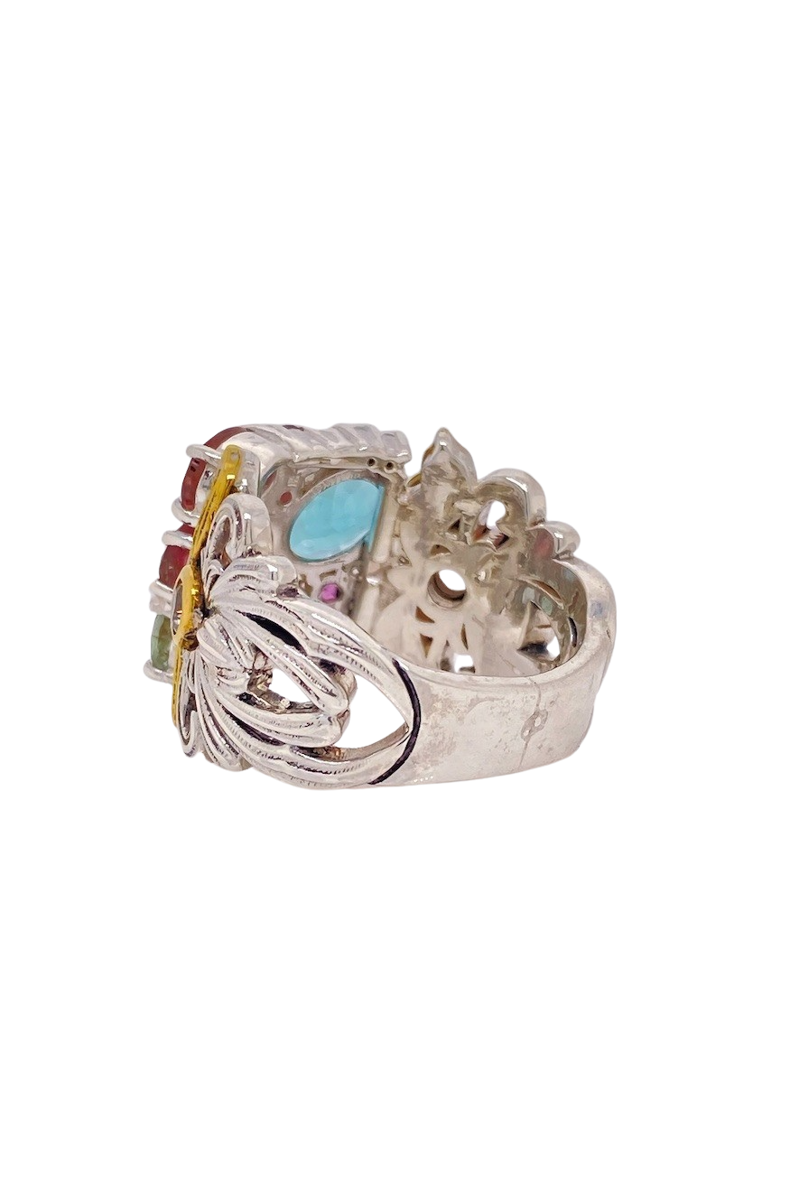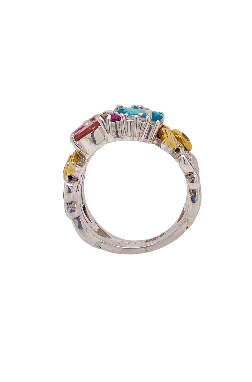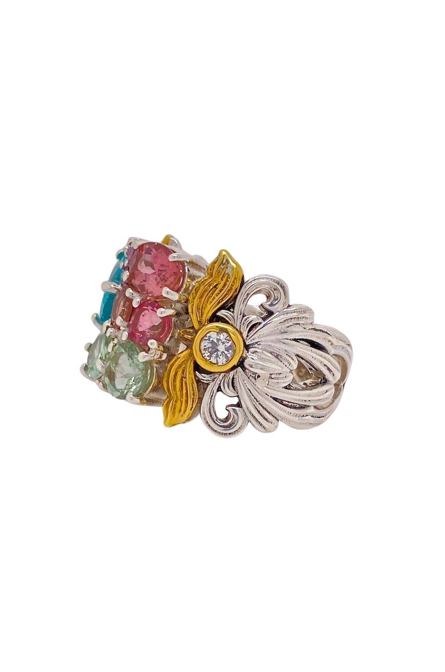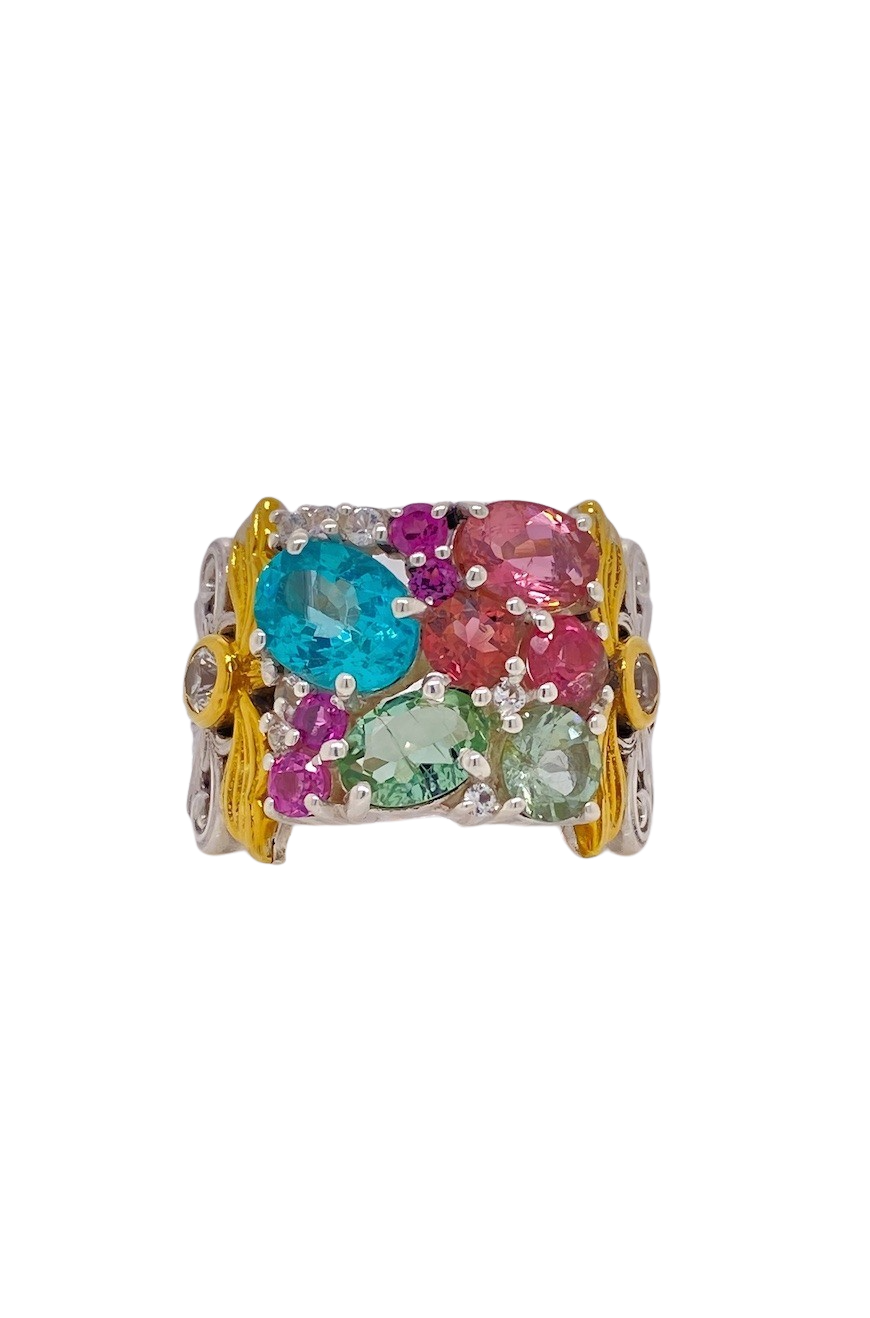 Celebrate colour and individuality with this Sterling Silver Tourmaline gemstone ring, featuring a stunning array of multi-toned Tourmaline gemstones and 3 small pink Sapphires. The claw-set stones create a vibrant rainbow effect, beautifully enhanced by brass shoulders and a detailed floral filigree band. Measuring 14mm x 15mm across the face, this ring is both eye-catching and contemporary, offering a bold yet timeless design. Perfect in size M ½ (7), it makes a unique statement piece for any jewellery collection.