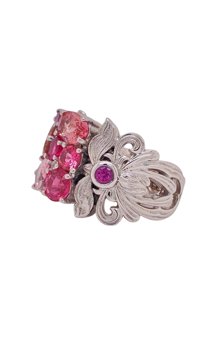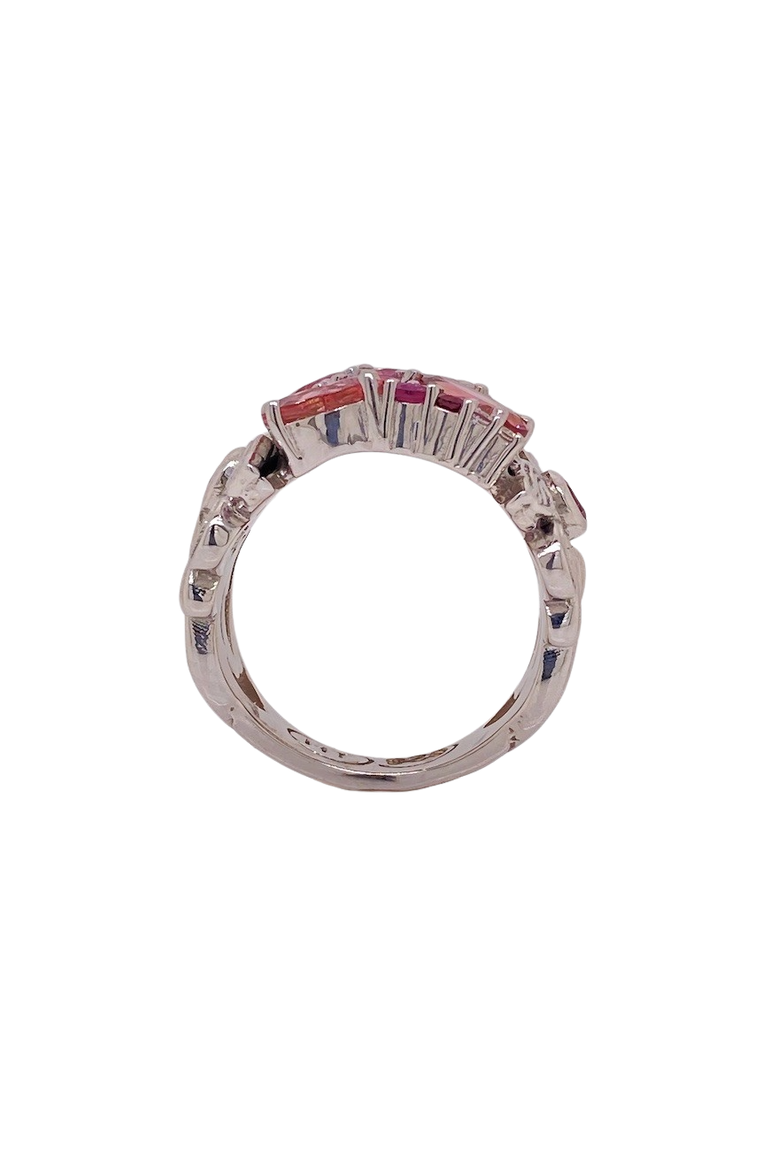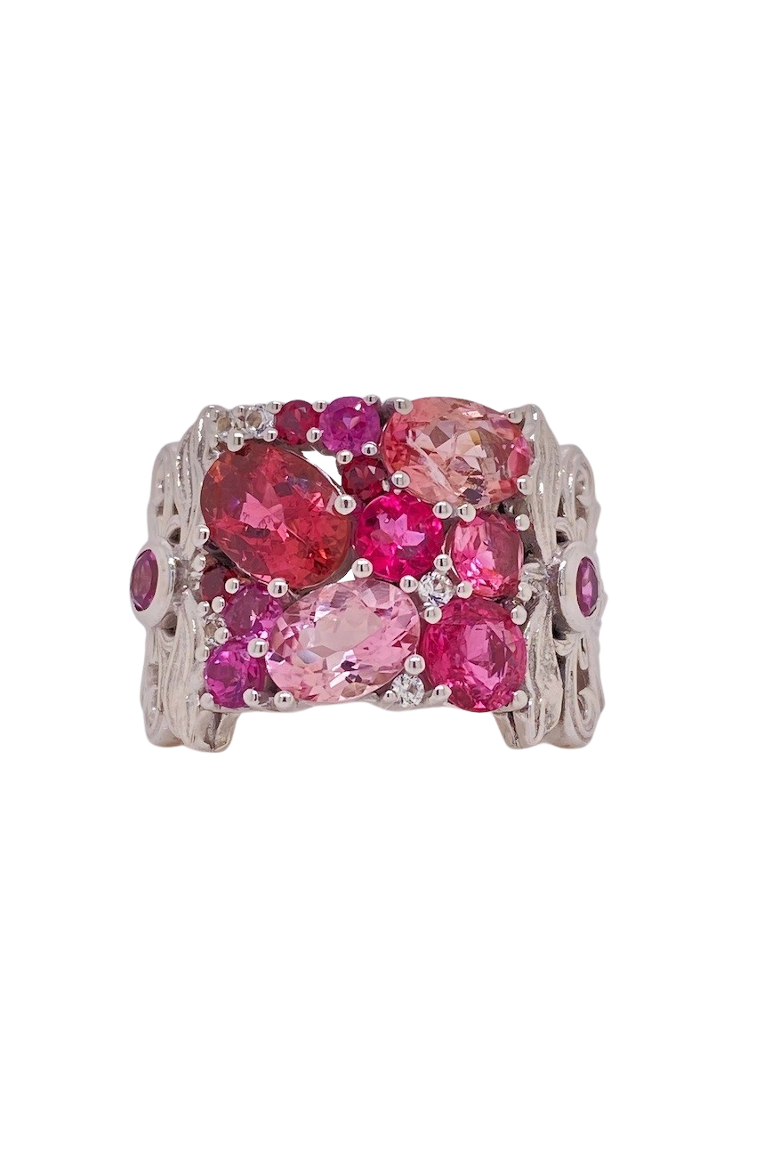 Showcasing a stunning array of warm, multi-hued Pink Tourmaline gemstones and 3 small pink Sapphires and further accented with sparkling Cubic Zirconia for a touch of brilliance. The 14mm x 14mm face makes a bold, eye-catching statement without sacrificing comfort, while the design ensures it works for any style or occasion. Crafted in size P (8), this ring balances modern elegance with everyday wearability, making it a versatile addition to any jewelry collection. Perfect as a standout piece on its own or layered with other rings, it adds a vibrant, sparkling touch to your look or makes a thoughtful gift for someone special.