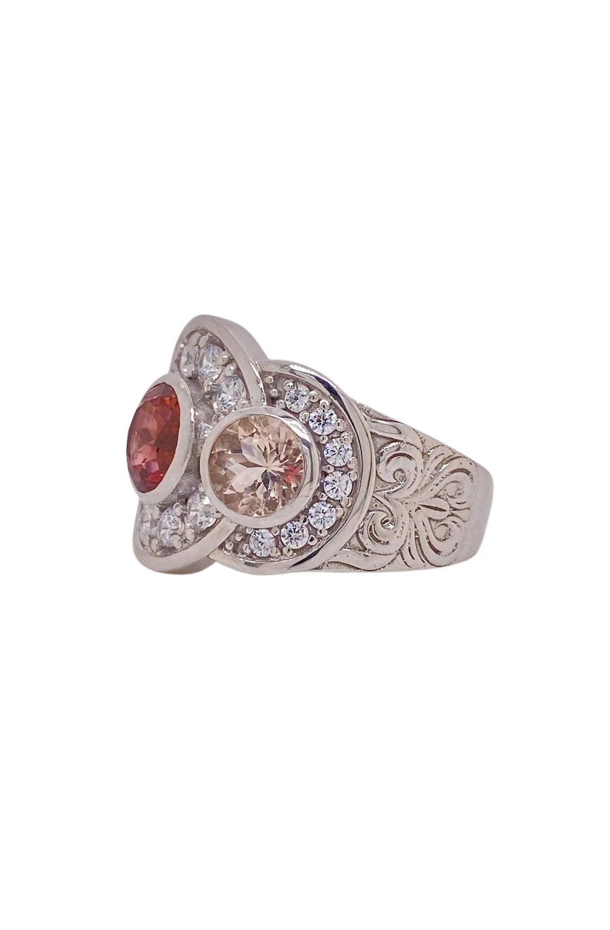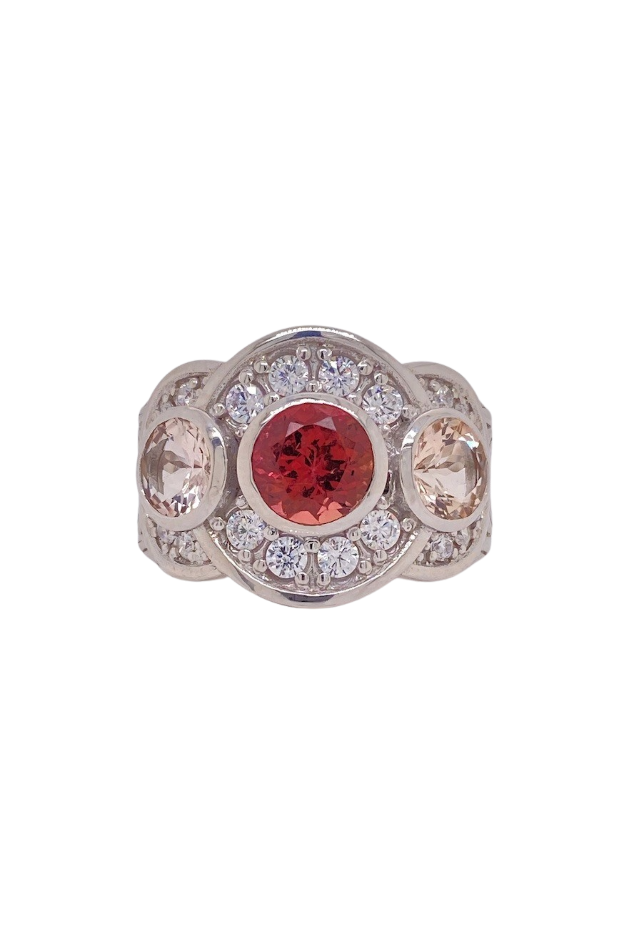 Elevate your jewellery collection with this stunning Sterling Silver Pink Tourmaline and Morganite Ring, beautifully accented with Cubic Zirconia. The 7mm round faceted Pink Tourmaline centre gemstone radiates a captivating blush tone, flanked by two 5mm round faceted Morganite gemstones that add warmth and elegance. Delicate swirling filigree detailing and shimmering Cubic Zirconia halos enhance the sparkle, creating a timeless and luxurious design. Crafted in solid sterling silver, this ring in size P ½ (8) is perfect for adding sophistication to everyday wear or making a statement on special occasions.