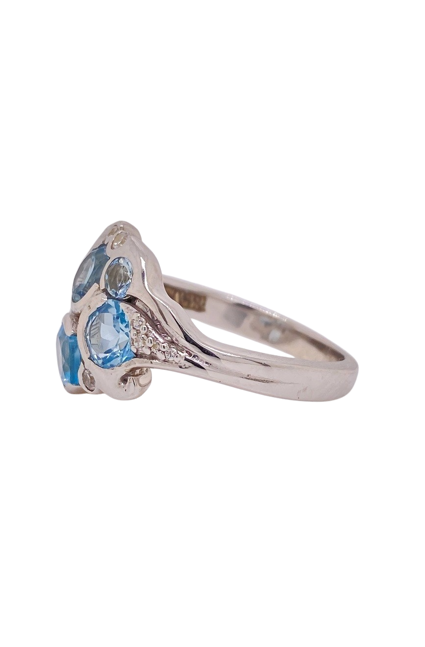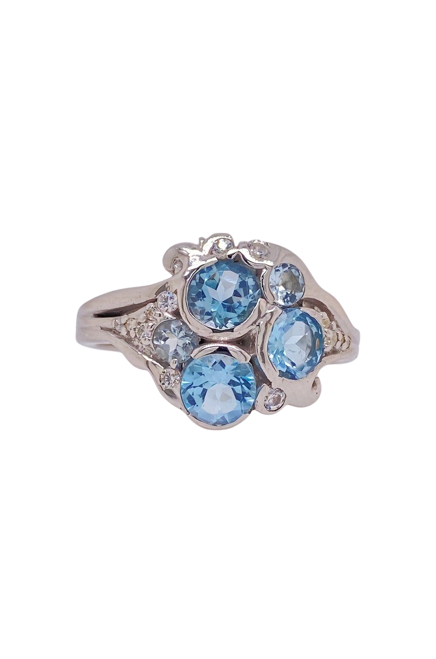 Elevate your jewellery collection with this stunning Sterling Silver Blue Topaz cluster Ring, beautifully accented with sparkling Cubic Zirconia on the shoulders. Featuring three 6mm round Blue Topaz gemstones in captivating soft blue hues, with additional smaller Topaz gemstones, this ring exudes elegance and timeless charm. The high-polish Sterling Silver band provides a sleek and durable setting, making it perfect for everyday wear or special occasions. This Blue Topaz gemstone ring is sized P ¾ (8 ¼) and makes a meaningful gift or a treasured addition to your personal collection.