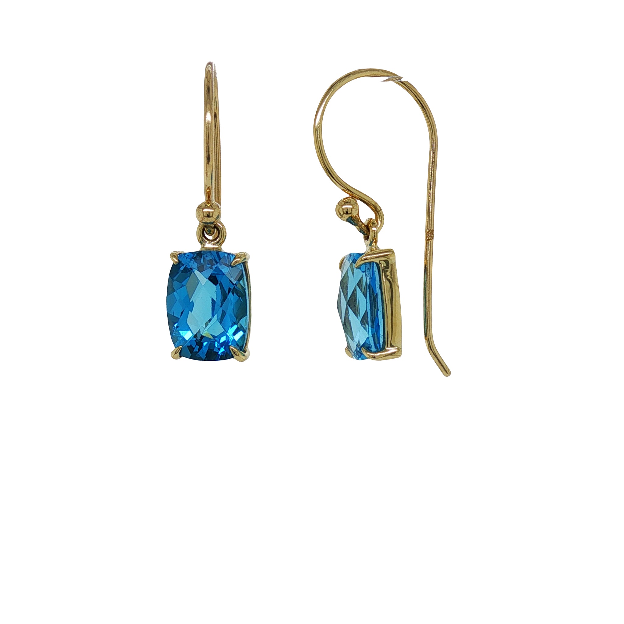 These exquisite 9ct Yellow Gold Swiss Blue Topaz earrings radiate a captivating brilliance. Each 8mm x 6mm Topaz gemstone is claw-set and beautifully checkerboard-faceted, allowing light to dance across every facet in a shimmering play of icy blue hues. Suspended gracefully on classic Shepherd hooks, their elegant design evokes a timeless, romantic charm — perfect for adding a touch of luxury and light to any occasion.