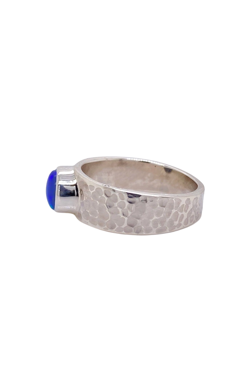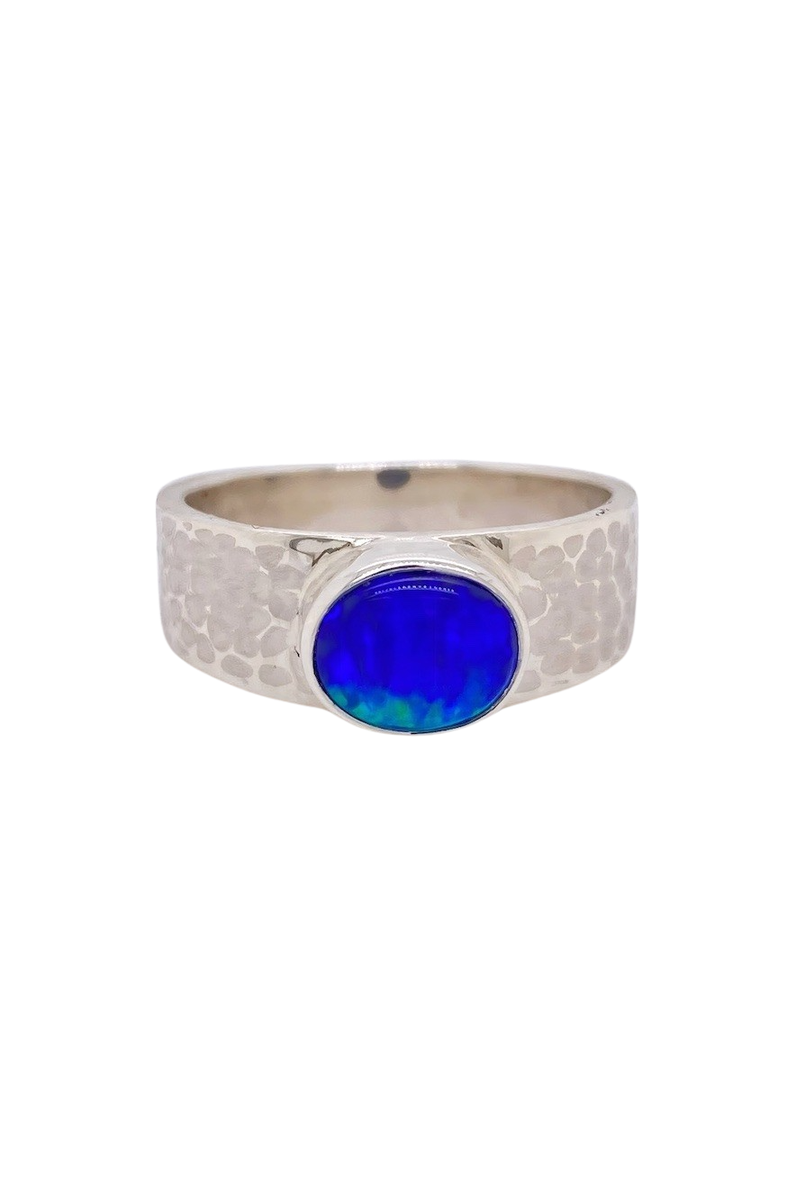 Elevate your jewellery collection with this enchanting Sterling Silver Lightning Ridge Opal ring, showcasing a mesmerising 7mm x 6mm Australian Opal—sourced from the legendary Lightning Ridge. This exquisite gemstone displays ethereal blue-green hues that shimmer with every movement, evoking the mystery of ocean depths and moonlit skies. Set in a sleek, polished dressed Sterling Silver band, this elegant piece is both a statement of natural beauty and refined design. Sized O ¾ (7 ¾), it’s perfect as a signature ring or a memorable gift imbued with timeless charm and Australian provenance.